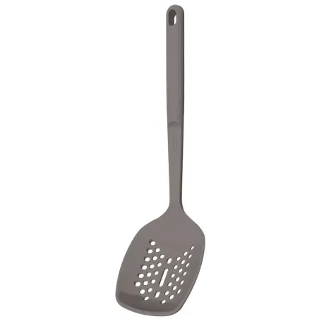 Силикон не повреждает антипригарное покрытие посуды, поэтому шумовка безопасна для кастрюль и сковород. Перфорация позволяет быстро сливать жидкость, а отверстие в ручке упрощает хранение на кухонных крючках.